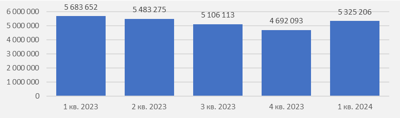 Диаграмма 1 — Динамика продаж на мировом рынке медной катанки и проволоки в 2023 – 1 кв. 2024 гг.
